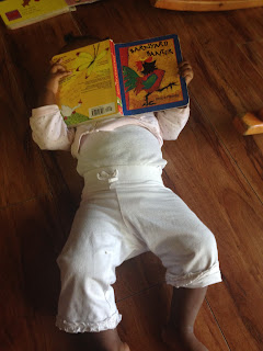 Our babies are getting bigger! L is now not only walking, but running, except when he's crashing, as seen above (we went to one nap this month). He knows the signs for "please", "thank you", and "all done" and the signs to answer "Who made you?" (God did) and "What else did God make?" (All things.) He doesn't talk much but did say "showtime!" and "Tadiwa!" this month so I wouldn't be surprised if his language starts exploding any day!